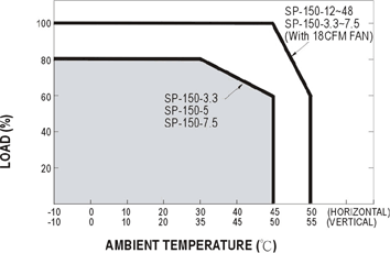 Ex. SP-150產(chǎn)品減額曲線,一般橫置/立式的應用環(huán)境溫度差5°C,而有強制散熱/自然散熱差20%輸出功率。