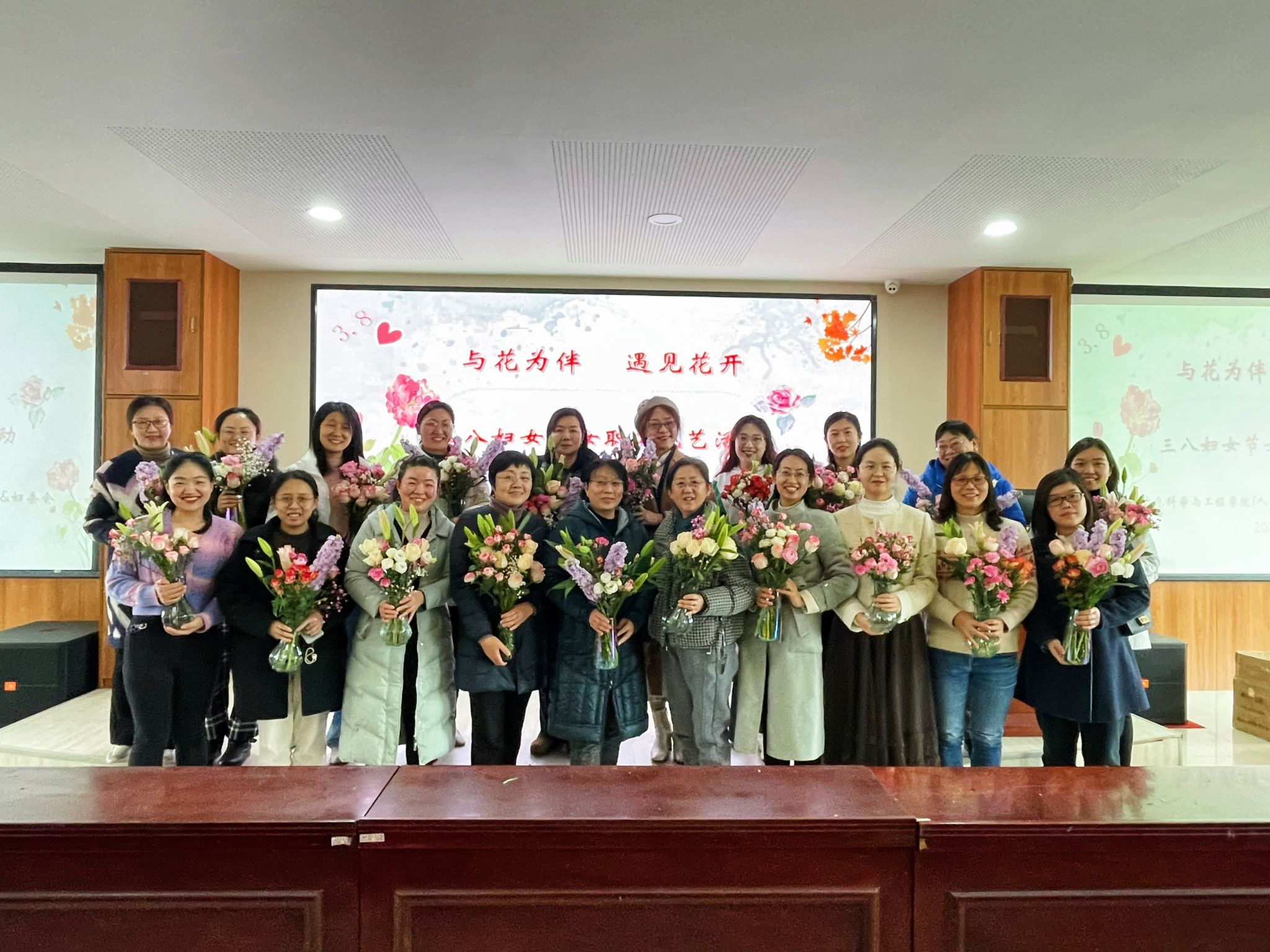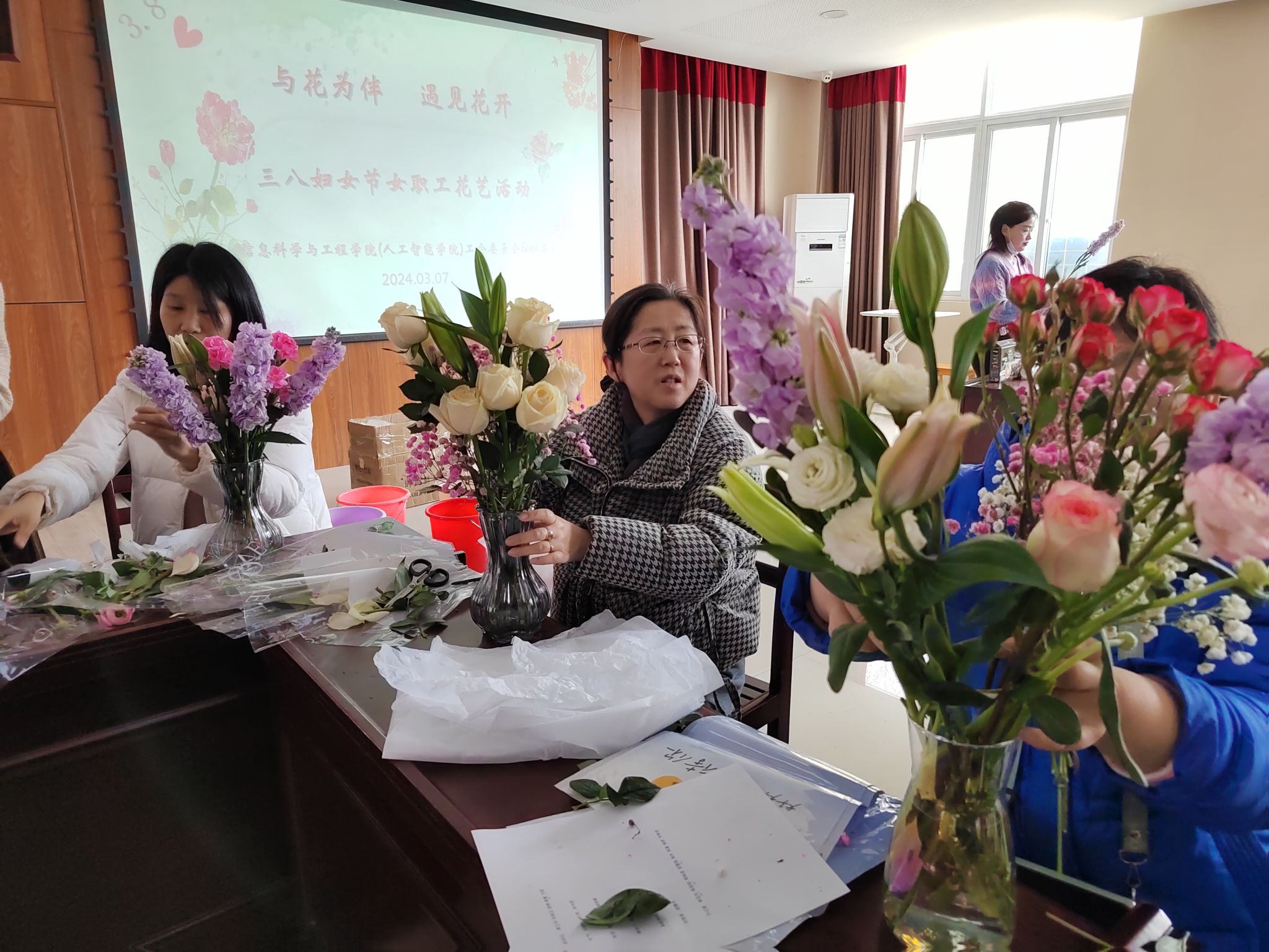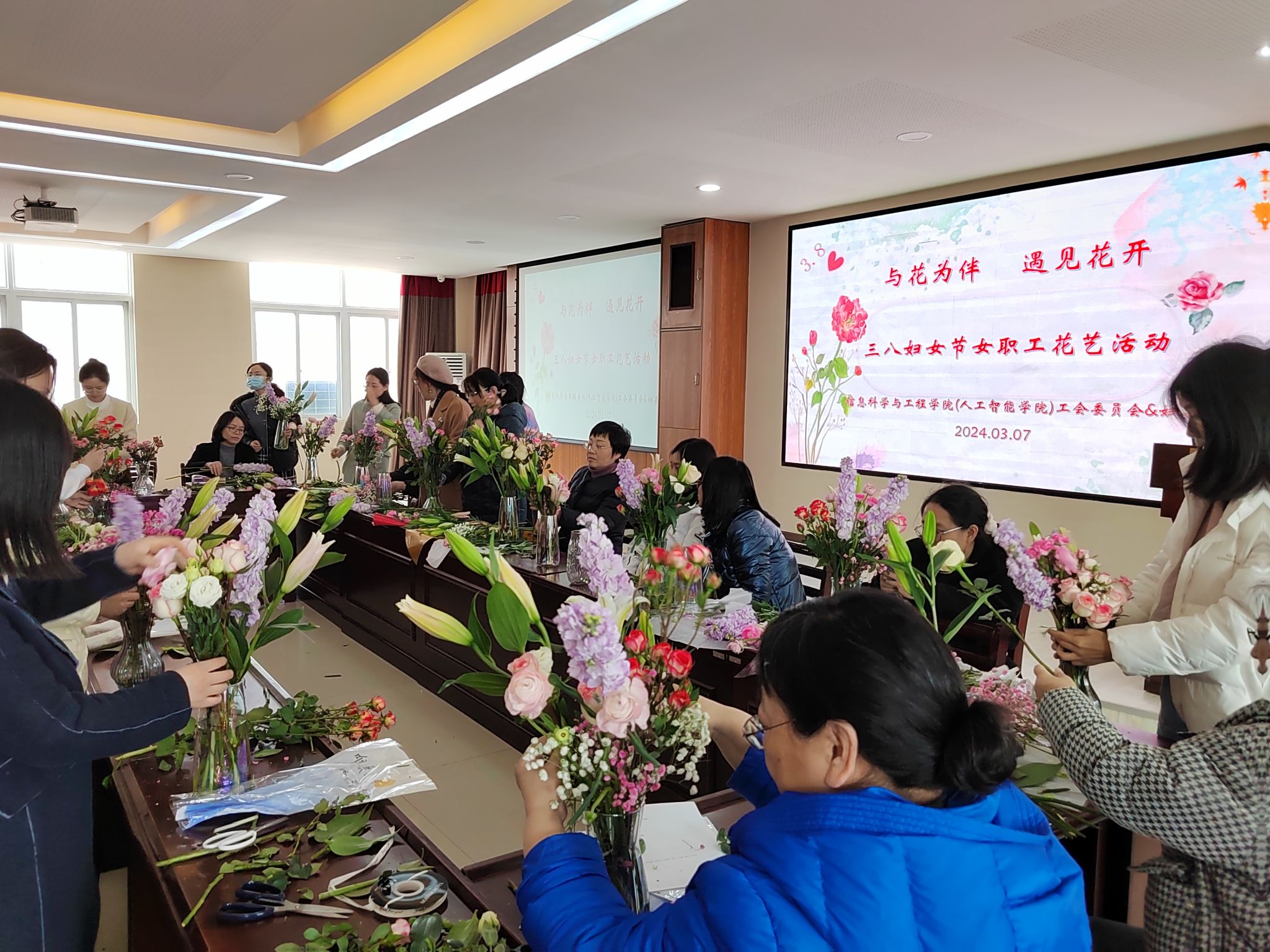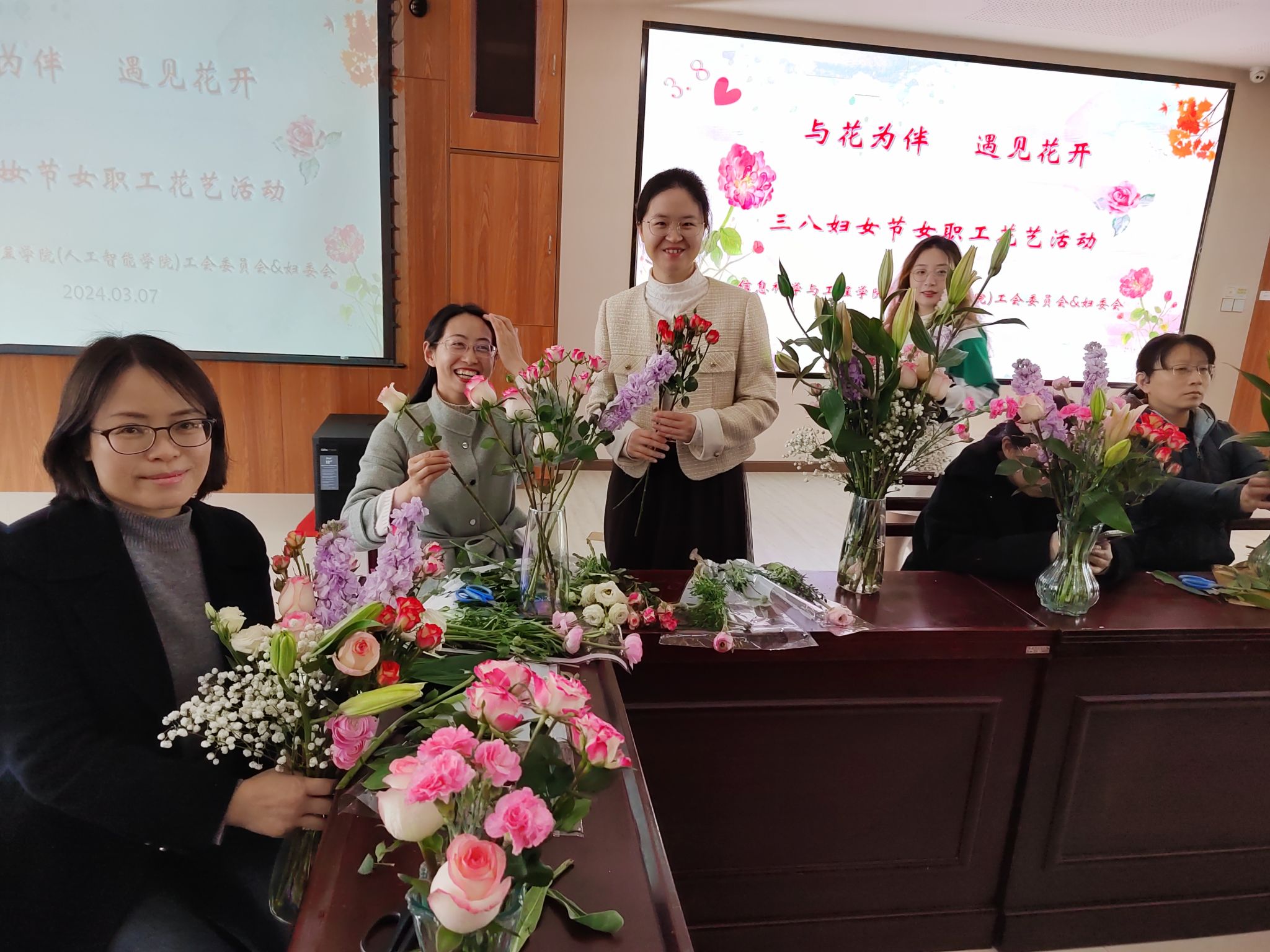 3月7日下午2:30,在第114 “三八”國際婦女節(jié)即將到來之際,為了更好地展現(xiàn)女性風(fēng)采,以健康向上、充滿活力的精神面貌樹立女性形象,信息科學(xué)與工程學(xué)院組織開展了“與花為伴,遇見花開”花藝活動,學(xué)院女職工們一起共慶節(jié)日!