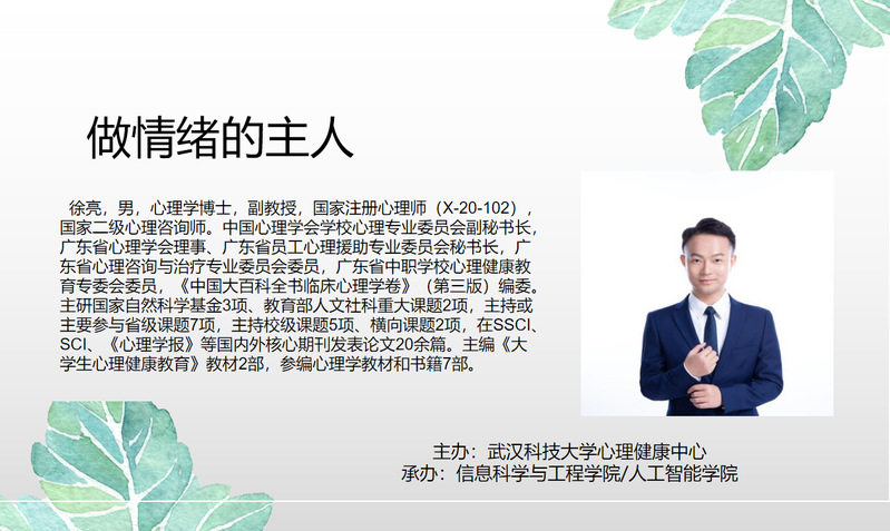 報告會圍繞情緒展開,由認識情緒與情緒管理兩部分組成。徐亮認同情緒對行為有著很大影響。首先通過各種的圖片,主講人徐亮帶領(lǐng)同學們認識了情緒,解讀了圖片中不易察覺的情緒。隨后講述該如何管理情緒,分享了很多的方式方法。其中包括“正念療法”,告訴同學們“正念療法是更多的去關(guān)注當下,可以通過散步等方式?!?/p>