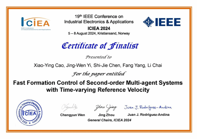 8月5日至8日,第19屆IEEE工業(yè)電子與應(yīng)用國際會議(19th IEEE Conference on Industrial Electronics and Applications, ICIEA 2024)在挪威克里斯蒂安桑召開。集團(tuán)人工智能與信息融合研究院易靜文副教授課題組碩士研究生曹曉穎的論文“Fast Formation Control of Second-order Multi-agent Systems with Time-varying Reference Velocity”榮獲ICIEA 2024最佳論文入圍獎。