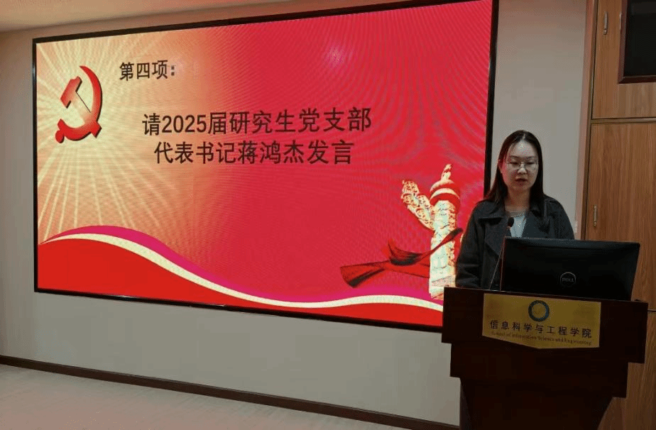 電子信息學(xué)院2025屆研究生黨支部代表書記蔣鴻杰發(fā)言。她提出了新一屆黨支部的工作計劃和目標(biāo),強調(diào)將圍繞學(xué)校和學(xué)院的中心工作,進一步加強黨支部的組織建設(shè)和思想建設(shè)。蔣鴻杰提到,新一屆黨支部將注重黨員的培養(yǎng)和發(fā)展,通過開展專題講座、交流研討等活動,提升黨員的綜合素質(zhì)和業(yè)務(wù)能力;同時,將積極探索創(chuàng)新黨建工作模式,開展具有特色的黨建活動,增強黨支部的吸引力和影響力。她還表示,新一屆黨支部將更加注重服務(wù)同學(xué),積極為同學(xué)們辦實事、解難題,努力使黨支部成為同學(xué)們的堅強后盾。蔣鴻杰最后表示,新一屆黨支部將團結(jié)帶領(lǐng)全體黨員,以更加飽滿的熱情和昂揚的斗志,為推動黨支部的發(fā)展和學(xué)校學(xué)院的建設(shè)貢獻自己的力量。